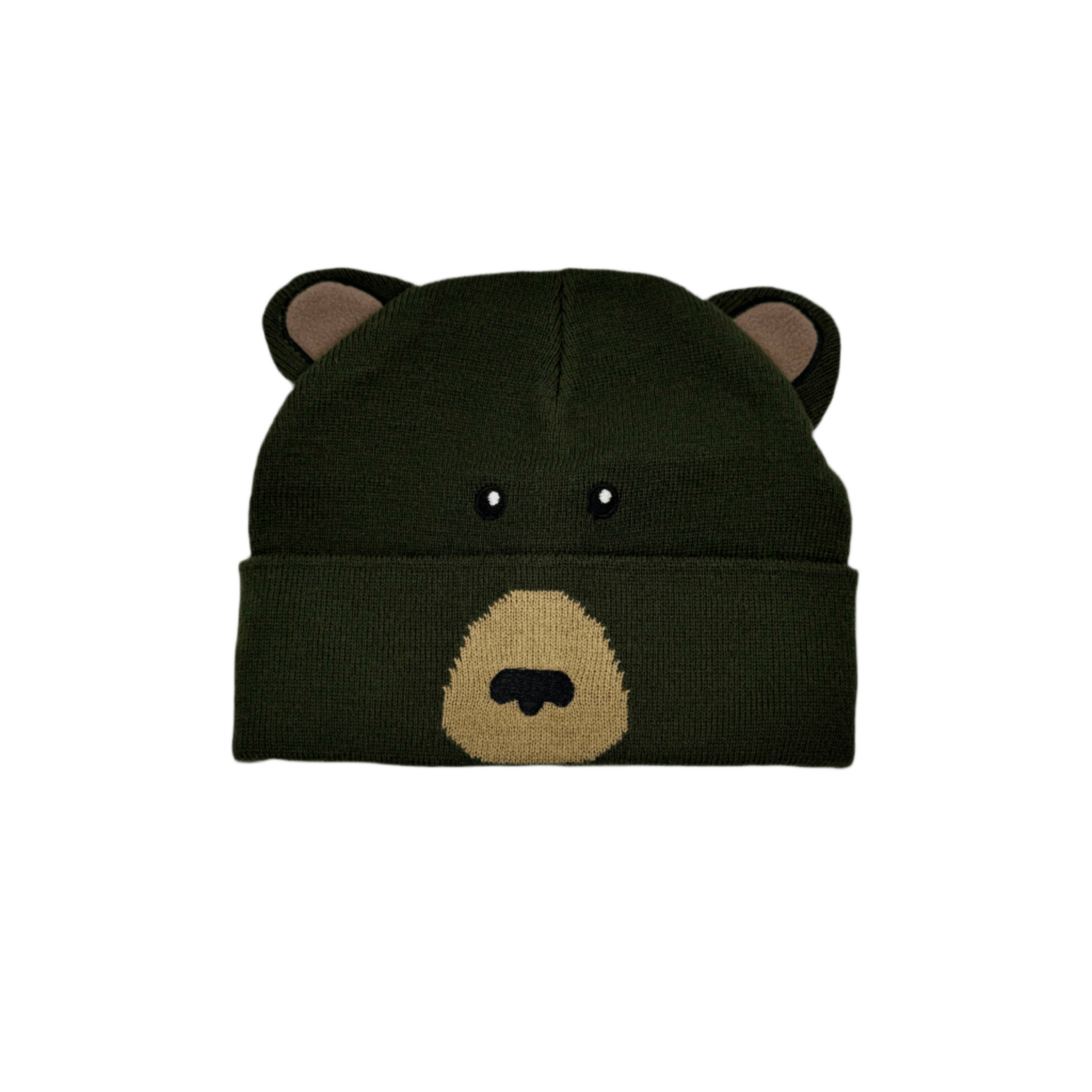 A kids’ beanie featuring a cute bear face on the front and soft, rounded ears on top. Made from warm, comfortable knit fabric, it adds a playful touch while keeping little ones cozy on outdoor adventures.