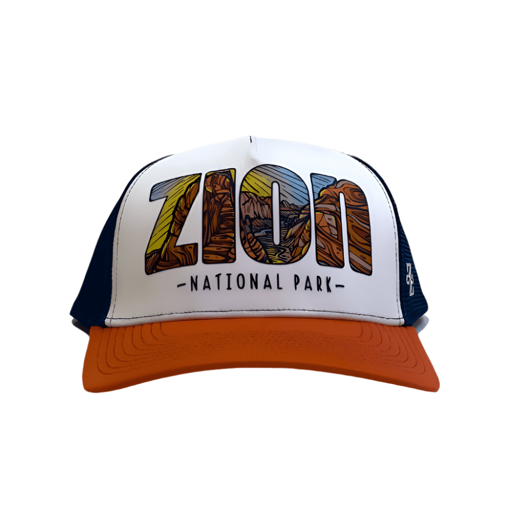 Our newest custom hat features a sandstone swirled ZION logo that pops from the front of this colorful hat.