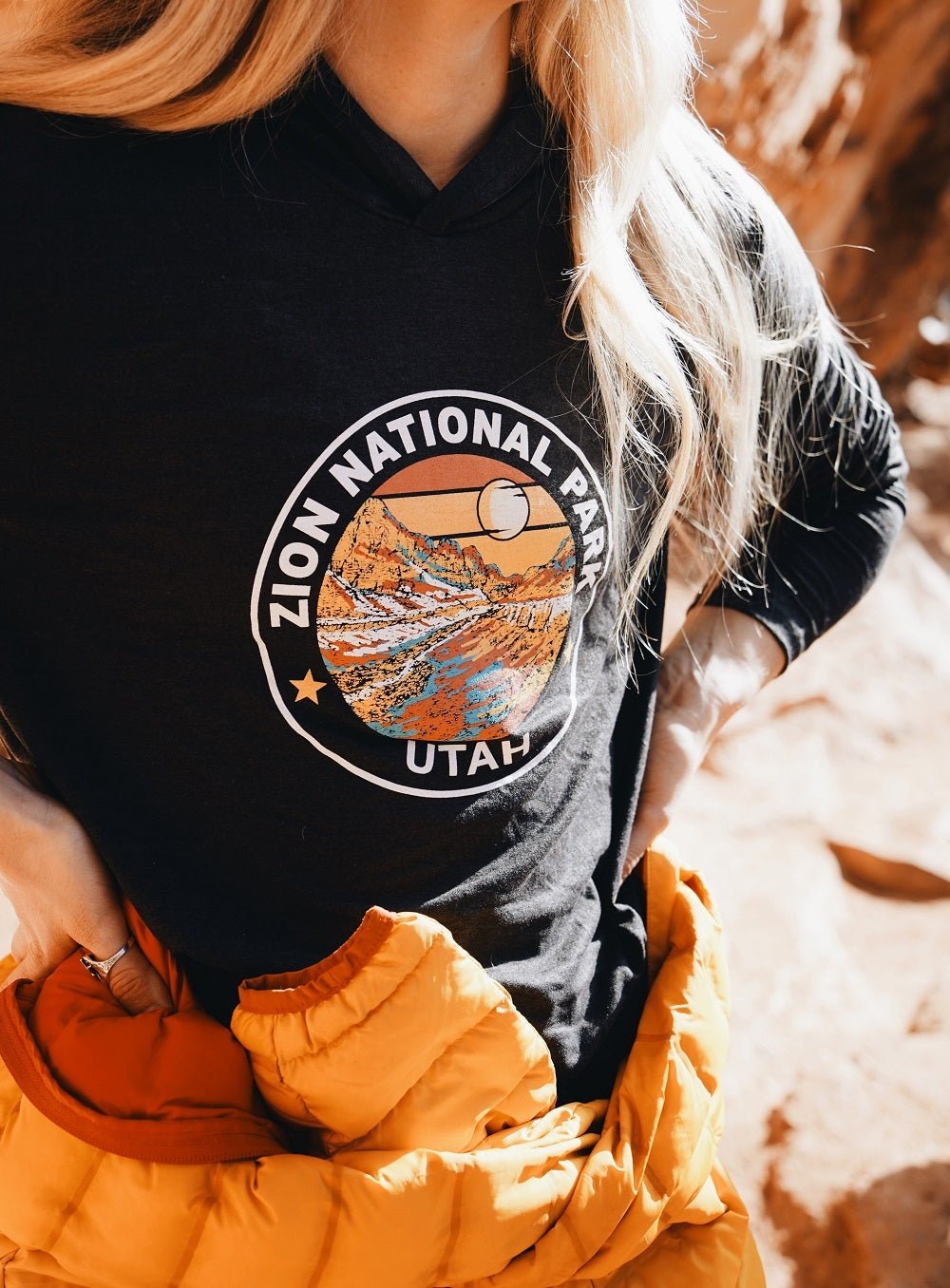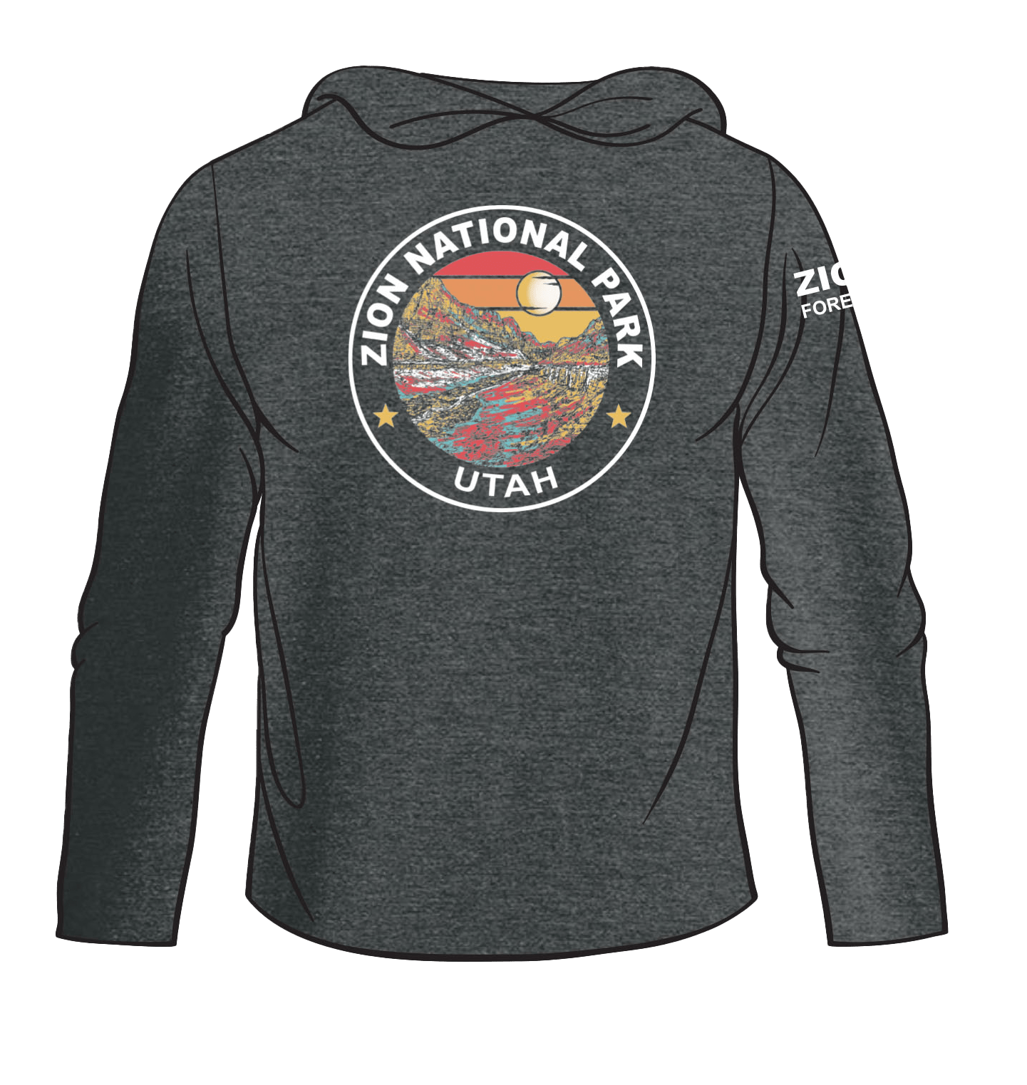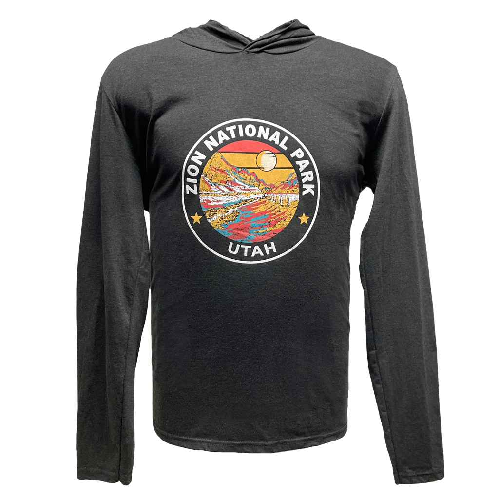 A lightweight, long-sleeve hoodie featuring an artistic rendering of Zion Canyon, with flowing lines and rich colors that capture the park’s soaring red cliffs and winding Virgin River. The design combines breathable comfort with a striking visual tribute to Zion’s natural beauty.