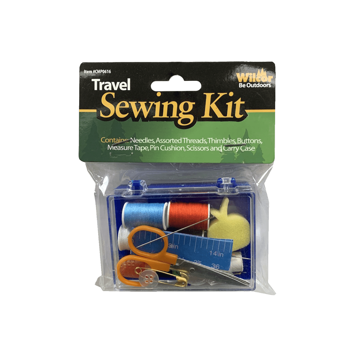 Contains: buttons, threader, needles, pins, thimble, measure tape, pin cushion in convenient carry case.