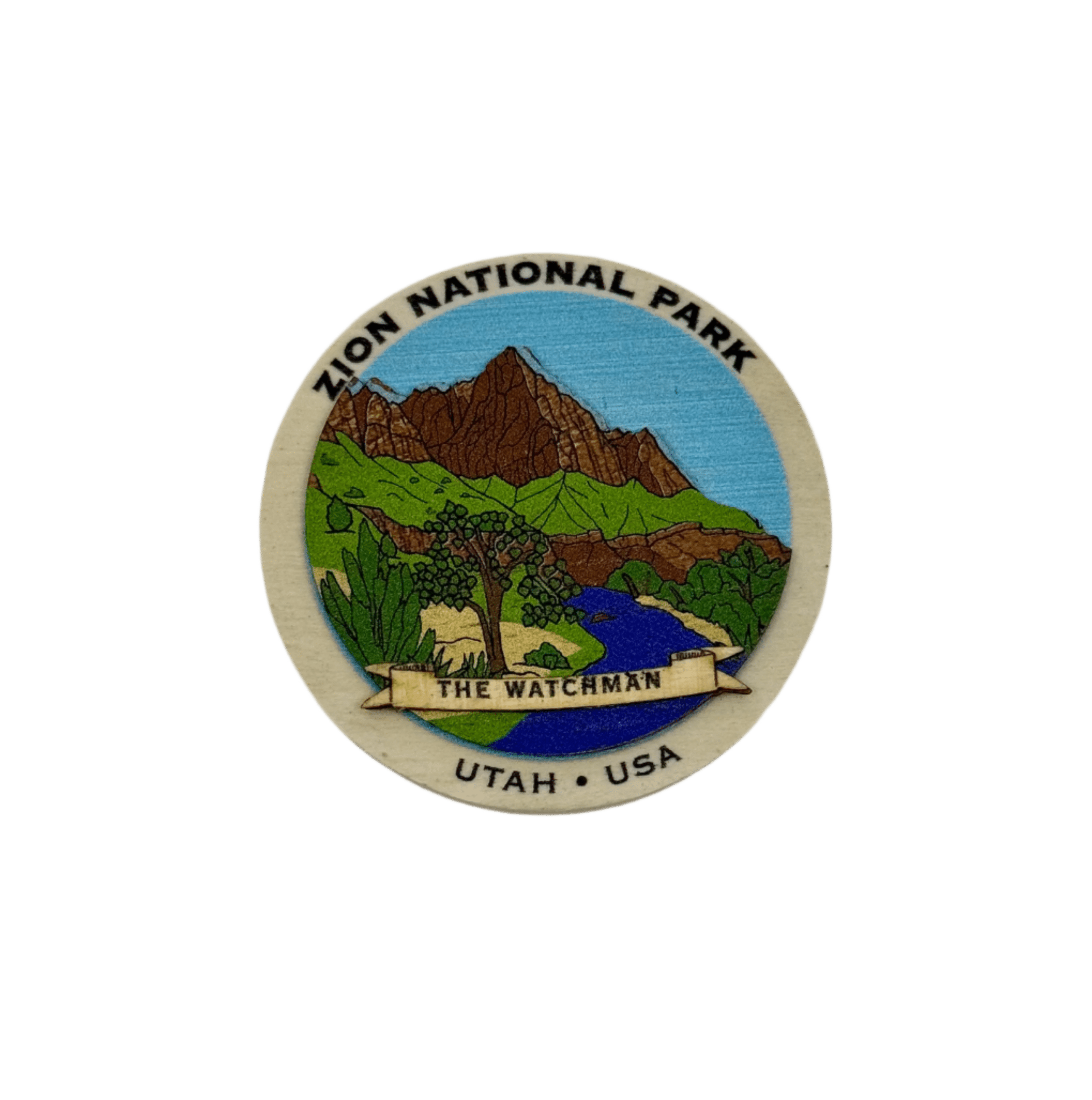 A round wooden magnet featuring The Watchman, combining natural materials with a detailed design of this iconic Zion landmark.