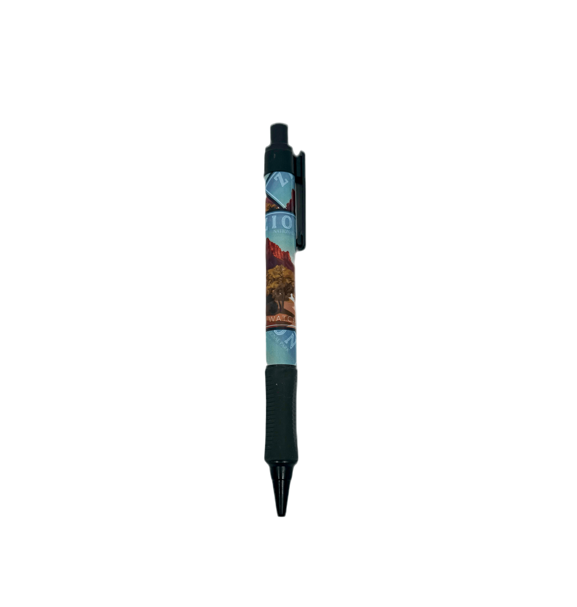 A black ink pen showcasing a retro art design of The Watchman, blending vintage charm with a tribute to one of Zion’s most iconic landmarks.