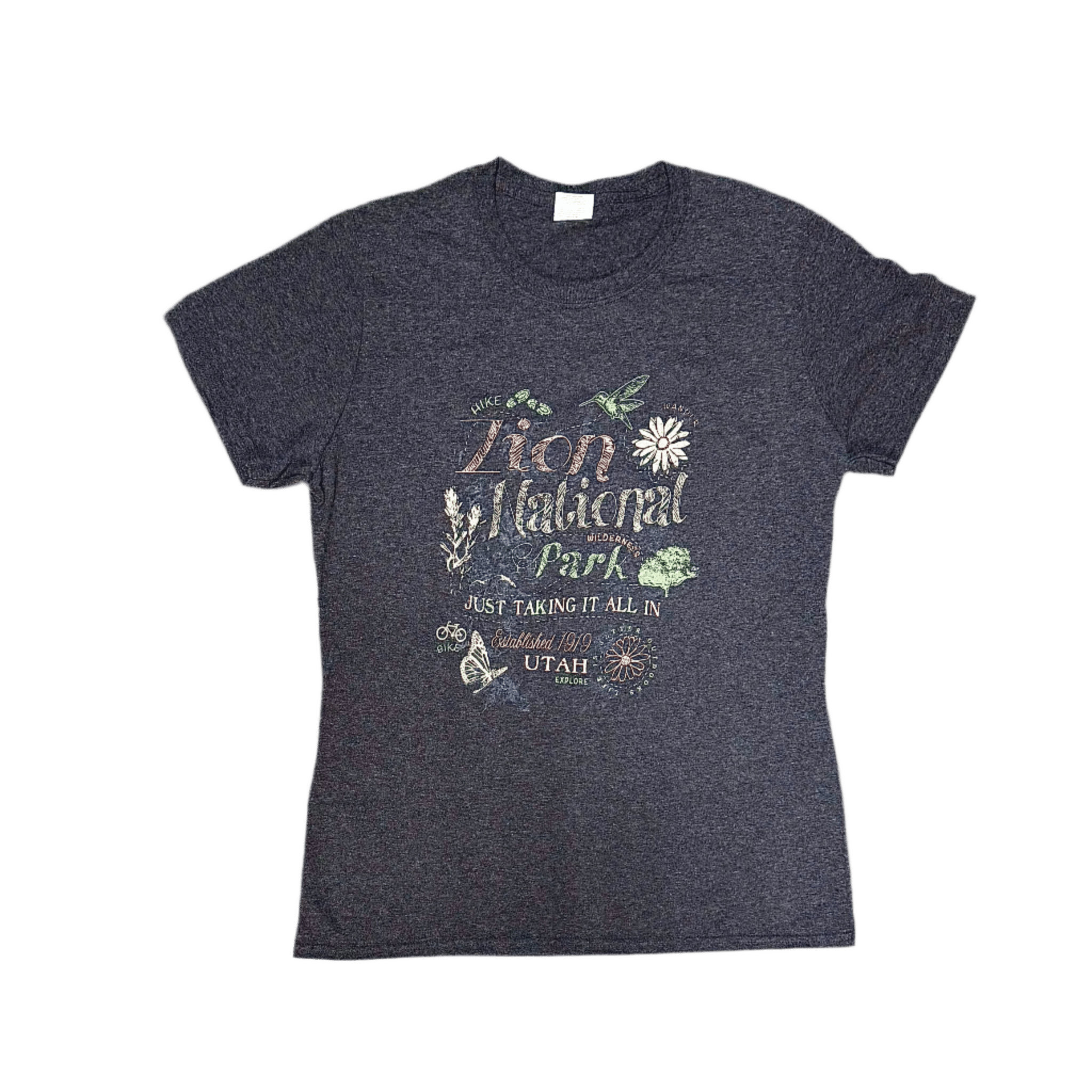 The Zion Chalk T-shirt features the inspiring phrase "Taking It All In" adorned with a delicate floral design, capturing the essence of mindfulness and appreciation for nature. Made from high-quality, breathable fabric, this shirt offers comfort and durability for everyday wear or outdoor exploration. Its thoughtful design connects you to the serene beauty of Zion National Park, making it an ideal choice for those who value both style and meaningful expression.