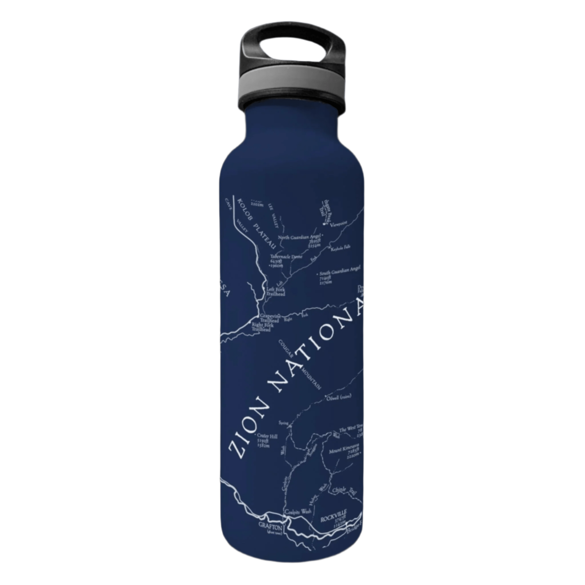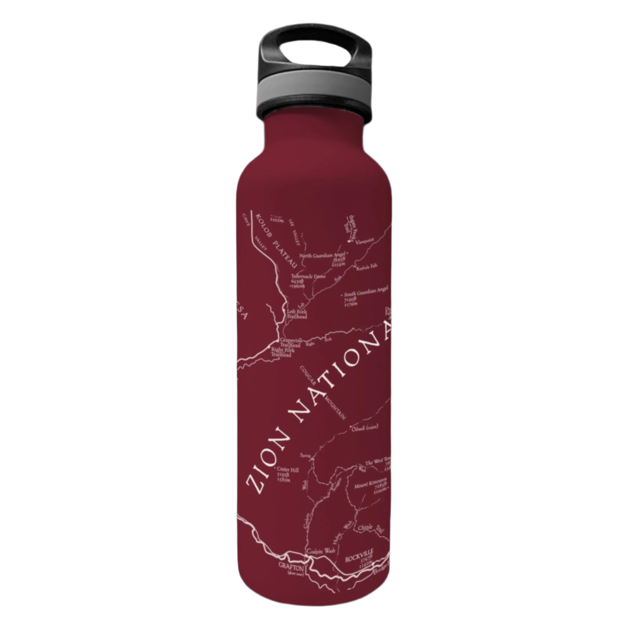 Stay hydrated in style with this durable water bottle featuring a detailed map of Zion National Park. Both functional and eye-catching, it’s perfect for keeping your drink cool while navigating trails or remembering your favorite canyon adventures.